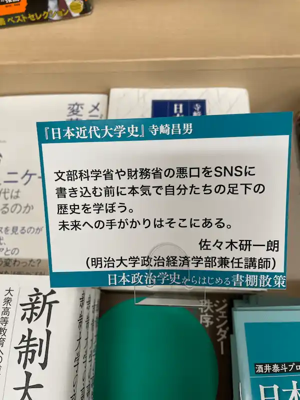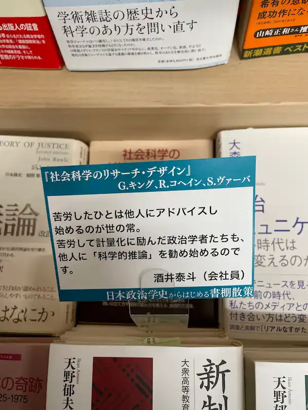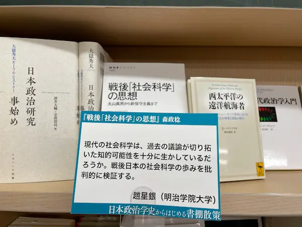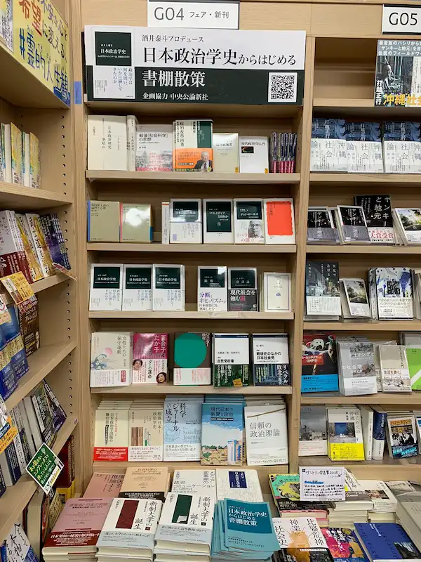 このWEBページは、酒井大輔 著『日本政治学史』 の刊行一周年を機に開催するブックフェア 「日本政治学史からはじめる書棚散策」 をご紹介するために、WEBサイト socio-logic.jp の中に開設するものです。 本ブックフェアは、2025年12月~2026年1月に、紀伊國屋書店 新宿本店三階にて開催されます。フェア開催中、店舗では 選書者たちによる解説を掲載した24頁のブックレットを配布しますが、このWEBページには その内容を収録していきます。 なお、過去にも本フェアと同趣旨のブックフェアを開催しています。そちらの紹介ページもご覧いただければ幸いです: