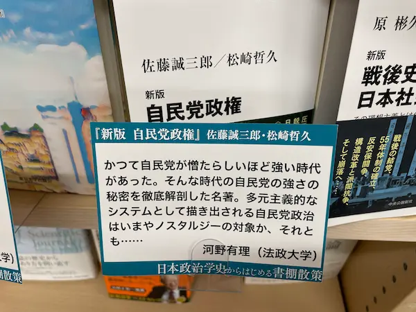 本ブックフェアの開催年である2025年は、戦後日本政治を指し示す「五五年体制」が成立して70周年にあたる。この成立については、『日本政治学史』に収録された、第二章「英雄時代──講和独立から高度成長期へ」において取り上げられている。他方、終焉については、第四章「新しい流れ──1980年代の断絶と連続」と第五章「制度の改革──平成の時代」において言及されている。