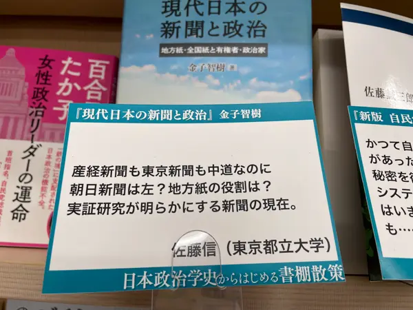 大変残念ながら日本の政治学には特定のメディアを対象とした分析はまだまだ多くない。NHKという日本のマスメディアを語る上で不可欠にして、政府からの影響を受けやすい組織に関しての政治学者による貴重なモノグラフとしてエリス・クラウス(村松岐夫,後藤潤平訳)『NHK vs 日本政治』をあげておく。また地方政治についての報道は多くを地方紙に負っている。その地方紙の影響についての貴重な分析として金子智樹『現代日本の新聞と政治』がある。